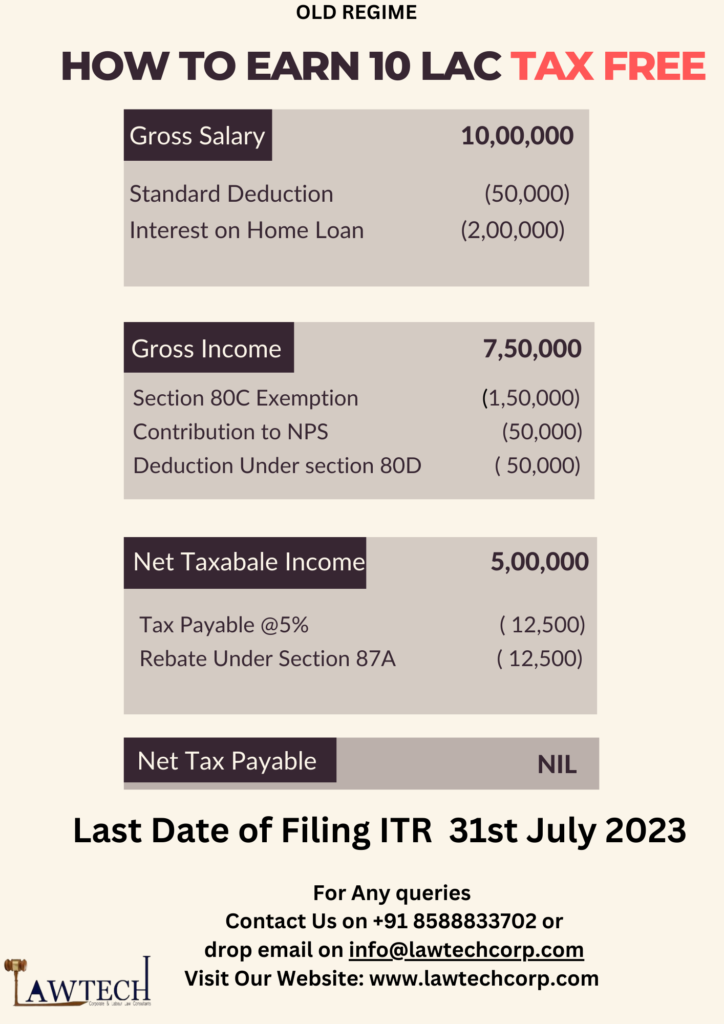How To earn 10 lac Tax Free If you earn a salary of 10 lakhs, you can avoid paying any tax by investing in tax-saving options and taking advantage of deductions and exemptions. By utilizing these strategies under the old tax regime, you can bring your net tax payable down to zero Latest News Navigating the Latest GST Changes: Key Highlights and FAQs from the 54th GST Council Meeting By admin / September 11th, 2024 Factory License Registration You Need to Know! By admin / September 7th, 2024 PM to launch India’s largest deep-water port Vadhvan today, to generate 12 lakh job opportunities: By admin / August 31st, 2024 Understanding India’s New Criminal Laws: Key Highlights By admin / July 1st, 2024 STARTUP INDIA REGISTRATION-START WITH LAWTECH By admin / June 20th, 2024 Best Payroll Consultant for Your Business By admin / June 19th, 2024 GUIDE TO FILING YOUR INCOME TAX RETURN (ITR) BEFORE 31ST JULY 2024 By admin / June 12th, 2024 LAW FAVORS THE VIGILANT, NOT THE SLEEPY: BOMBAY HIGH COURT RULING By admin / May 30th, 2024 EMPLOYMENT LAW RELATED TO REMOTE WORK POLICIES By admin / January 23rd, 2024 AYODHYA MANDIR- A CONTROVERSIAL ASPECT OF INDIA By admin / January 16th, 2024 📢 *JOIN OUR GROWING TEAM! 🌟* By admin / January 8th, 2024 5 NEW INCOME TAX RULES THAT WILL IMPACT YOU IN 2024 By admin / January 3rd, 2024 Supreme Court’s Landmark Ruling Extends Pollution Control Beyond Delhi NCR during Deepavali By admin / November 8th, 2023 LEGAL APPROVAL REQUIRED TO RUN A HOSPITAL IN INDIA By admin / August 14th, 2023 NAVIGATING THE LEGAL EVOLUTION : NEW CRIMINAL SYSYTEM BILL IN INDIA By admin / August 12th, 2023 How To earn 10 lac Tax Free By admin / July 18th, 2023 Mobile Phone GST Rate Slashed in July 2023! Discover the Key Information You Shouldn’t Miss! By admin / July 8th, 2023 Embracing the Benefits of Yoga: Integrating it into our Daily Lives By admin / June 21st, 2023 World Environment Day: Empowering Change for a Sustainable Tomorrow By admin / June 5th, 2023 Supreme Court Quashes POCSO Conviction, Citing Consensual Relationship and Family Welfare By admin / November 1st, 2025 CHEQUE BOUNCE COMPLAINTS CAN BE FILED AGAINST CASH LOANS EVEN ABOVE ₹20,000: SUPREME COURT By admin / September 27th, 2025 Rights and Responsibilities of Landlords and Tenants in India: A Legal Guide by The Lawtech By admin / July 26th, 2025 Bombay High Court Clarifies: Bar Councils Not Bound by POSH Act for Advocates By admin / July 9th, 2025 CHILD CUSTODY LAWS IN INDIA By admin / June 20th, 2025